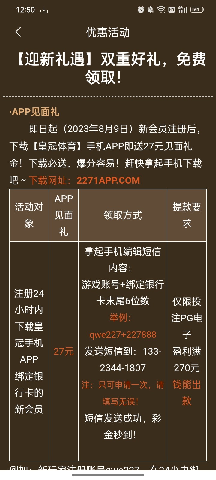 注册绑卡发短信送27,只限8.9日以后注册的用户,发了短信秒到账