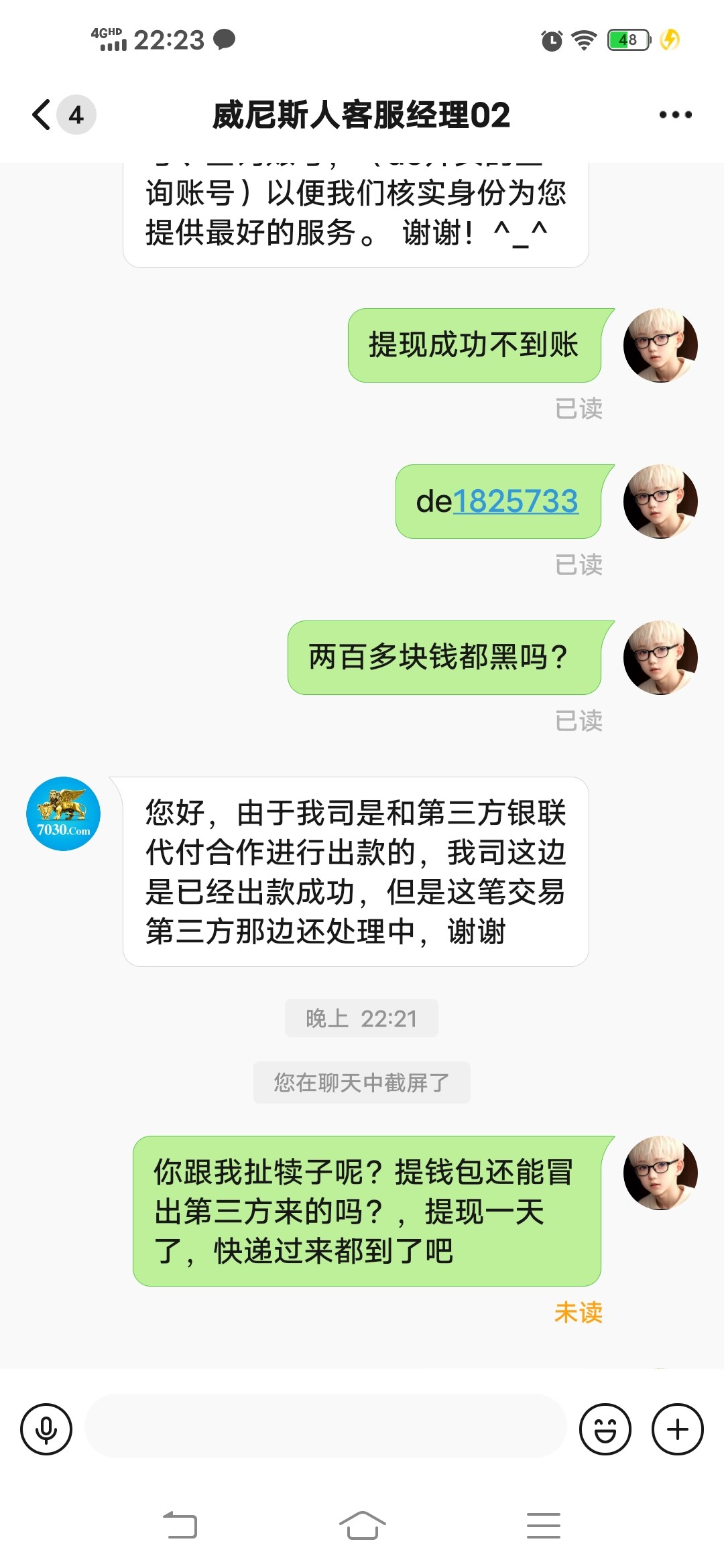 充值玩赢了提现显示成功没到账,找客服说主单异常,后面又说第三方延迟,提钱包还能冒出第三方来。牛逼!总之找各种奇葩理由就是不出款,黑台无疑了!大家千万别玩。