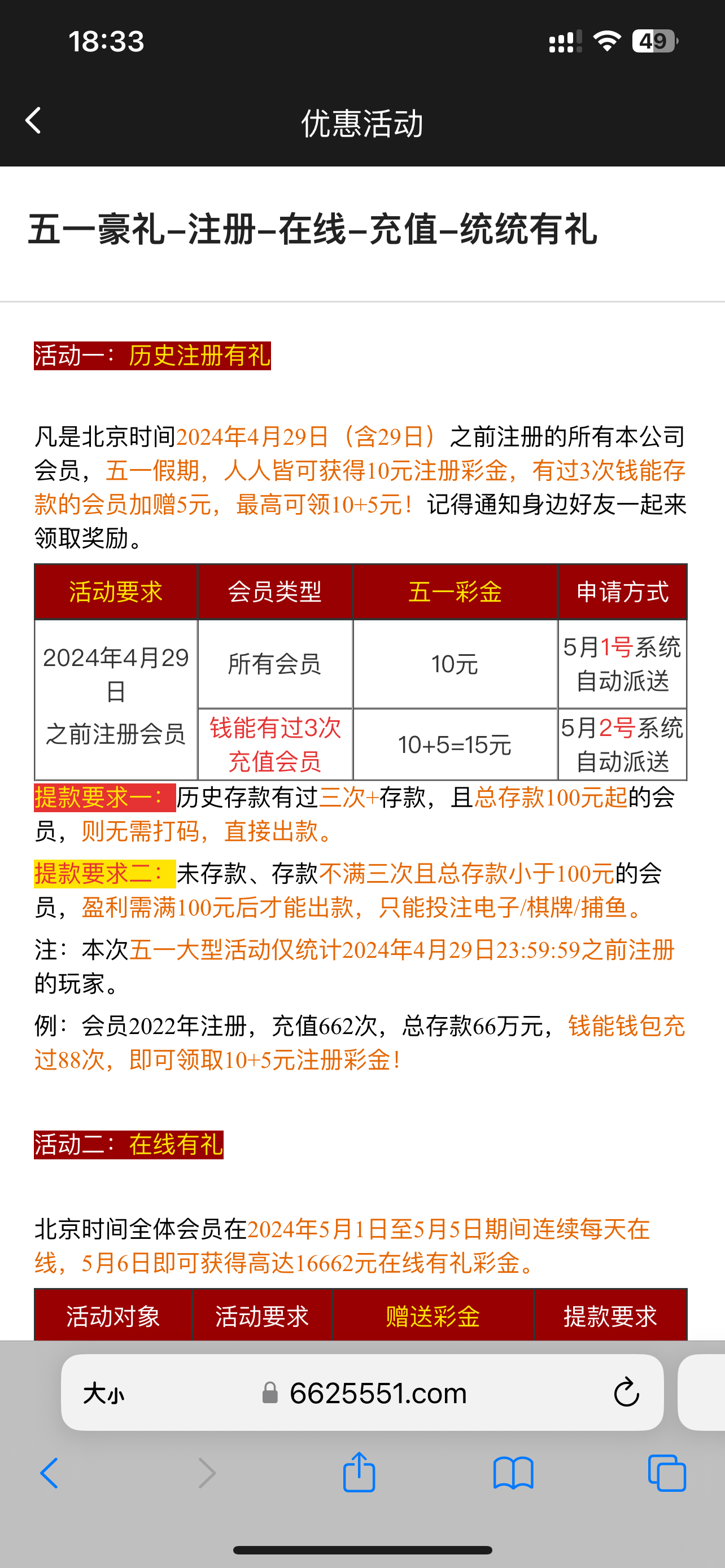 4.29之前注册的5/1回馈10有过充值的回馈15每日登入送3-16662每日还有抢红包活动