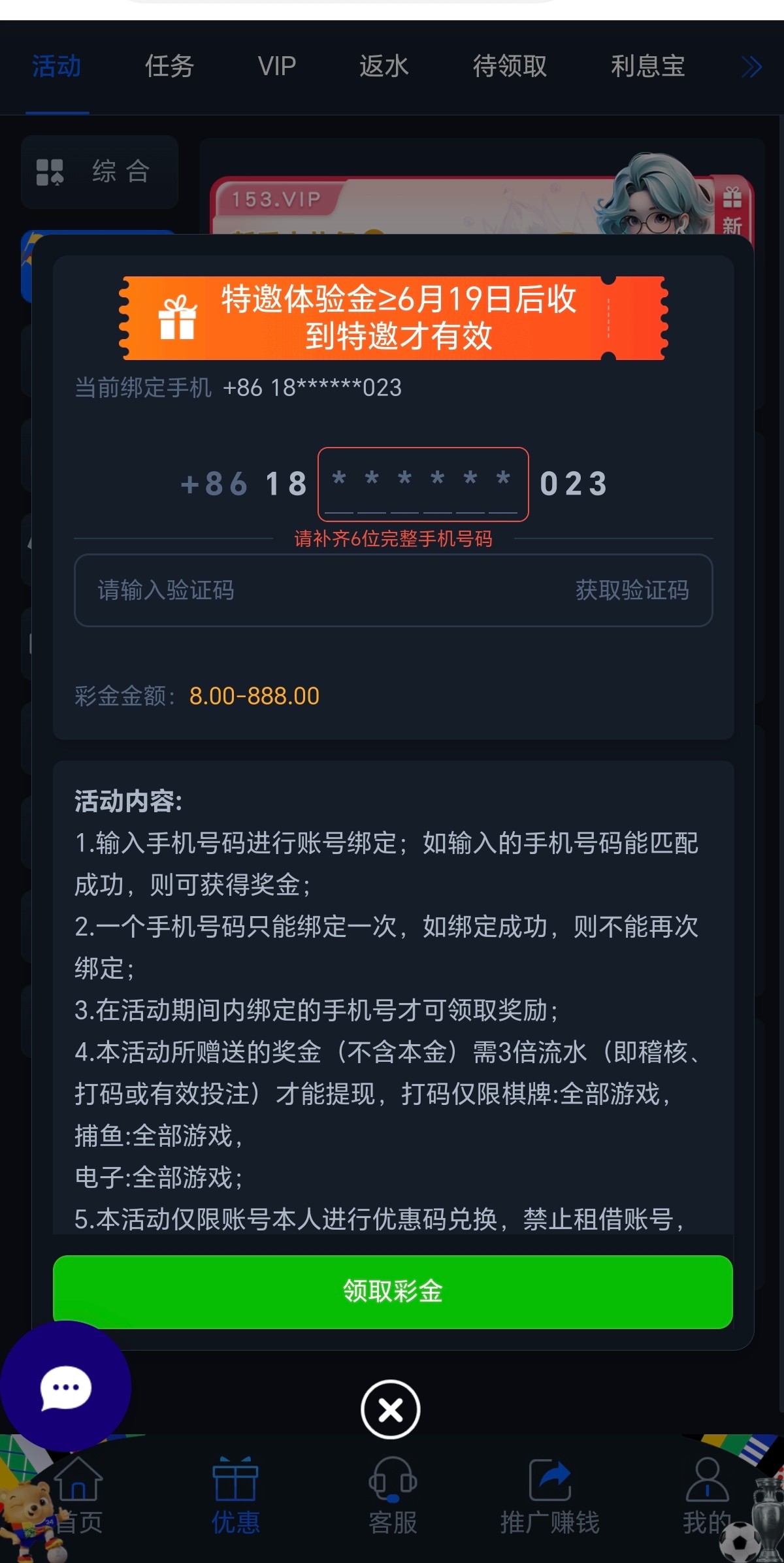 输入手机号验证是特邀秒18-888,三倍流水可提现,提现自测