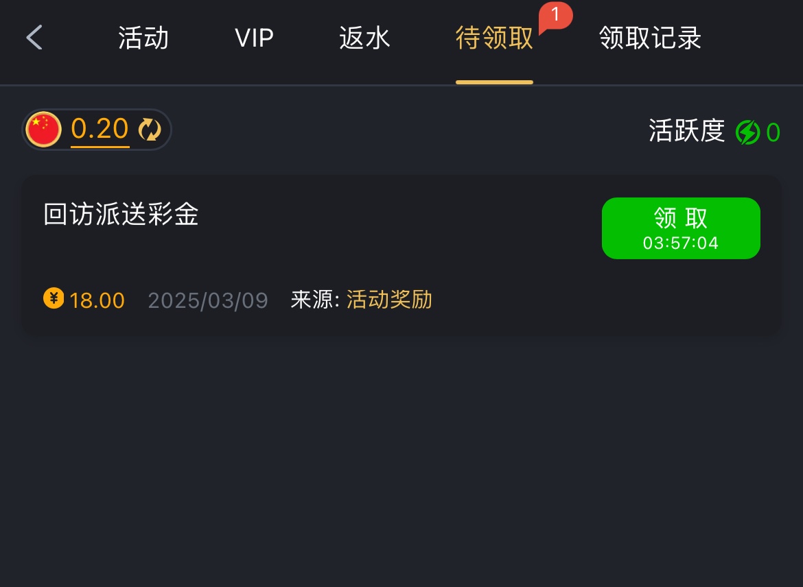 有号的兄弟可以上号看看有没有,彩金一倍流水,不能玩体育电竞彩票,其它的都能玩