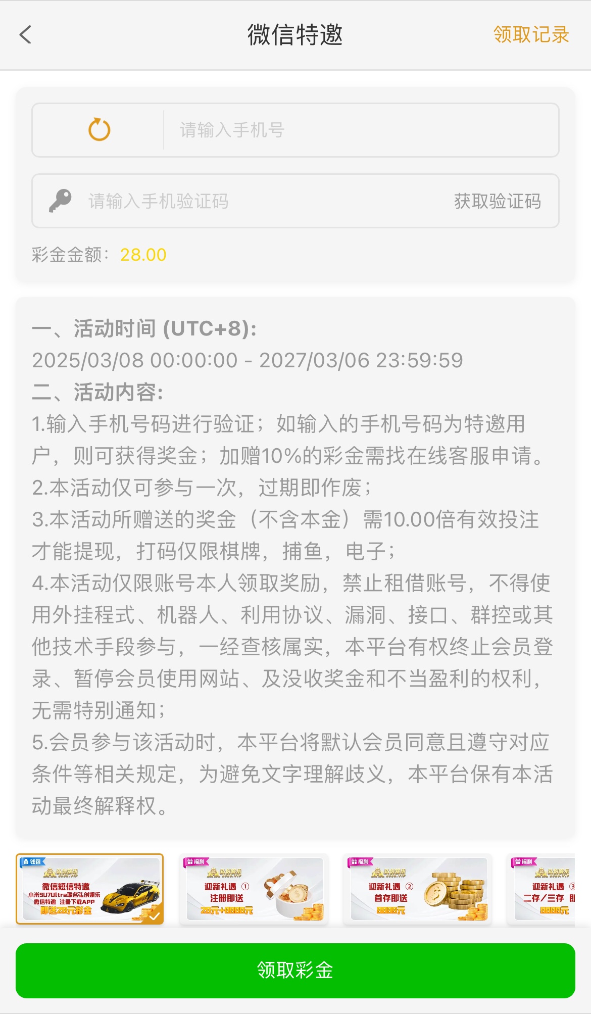 碰瓷微信特邀,优惠自助申请,10倍流水,限电子棋牌捕鱼,不是特邀可以下载APP绑卡24小时内送28,24内没送就是不符合自动送的,得有AB钱包取款