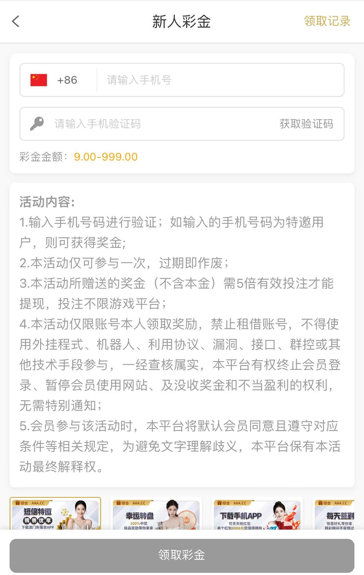 特邀碰瓷注册优惠里自助领取,彩金5倍流水