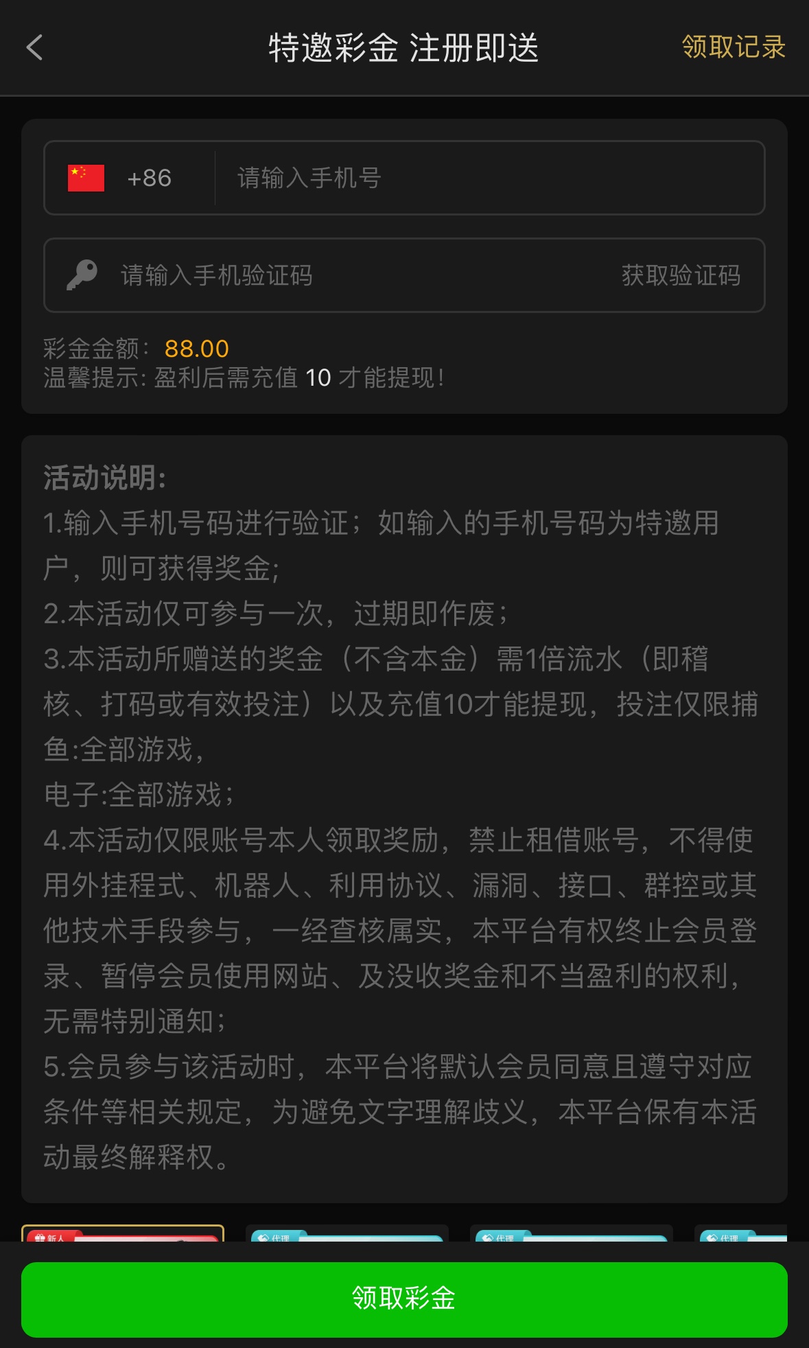 注册好了在优惠大厅自助申请,彩金1倍流水,限捕鱼电子,盈利后要充值10才能出款,自行分辨