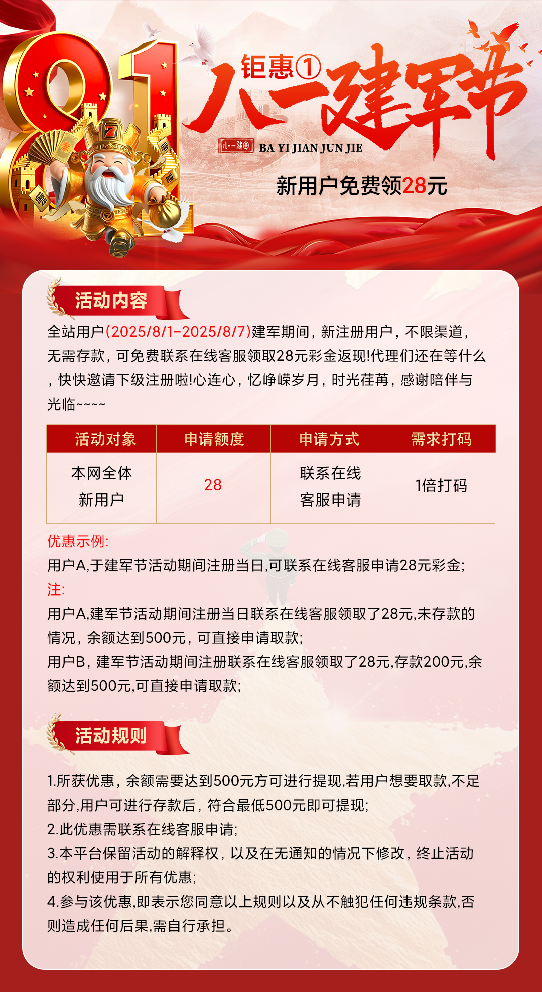 8月1号-8月7号期间注册送28彩金一倍流水联系客服领取,最低500提款