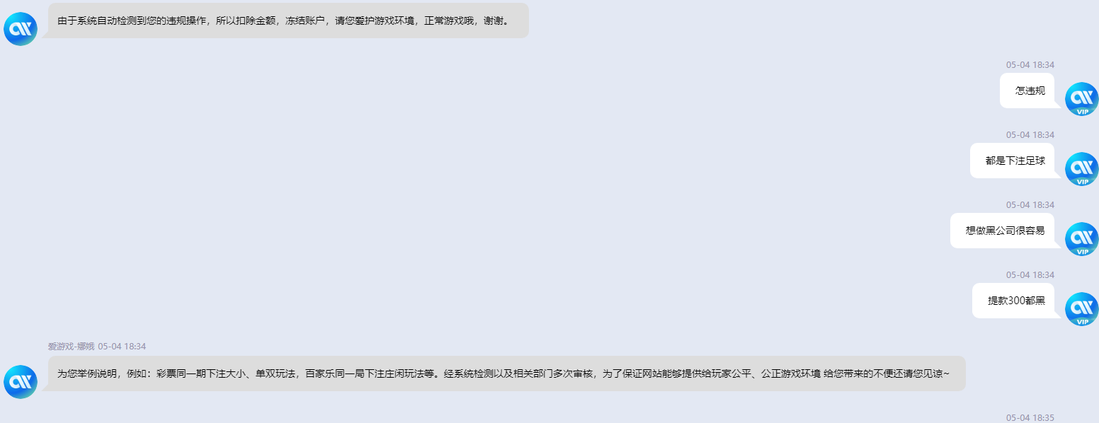 今天在爱游戏参加电话回访充值活动。充值了100送63活动。玩体育了300多。提款300竟然账号封了。然后说系统检测我玩百家乐违规。不过我只下了体育。。鸭脖系列都这样。赢钱就说了你们违规。大家去鸭脖公司注意了