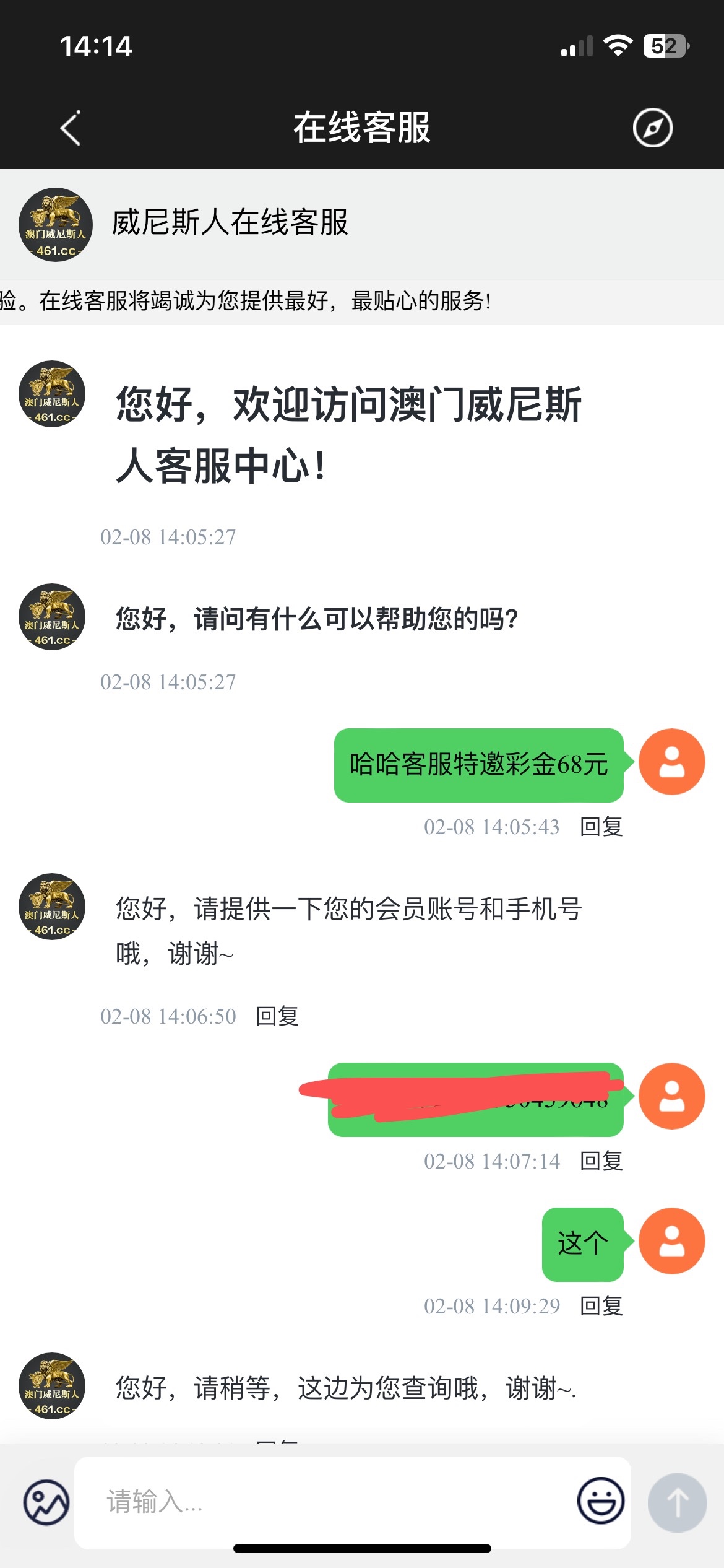 碰瓷特邀,申请彩金的时候和客服说  哈哈客服特邀彩金68元 说错话不会送,自己看情况处理