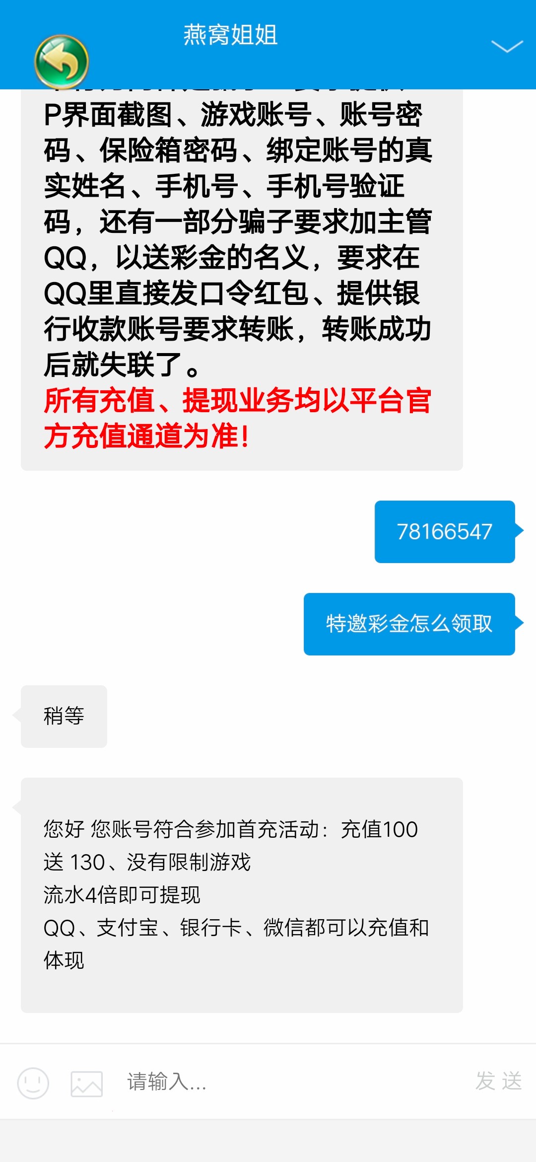 我收到短信了,不知道是不是一个台,易发棋牌,客服说100送130,白天说100送160,四杯水感觉是骗子
