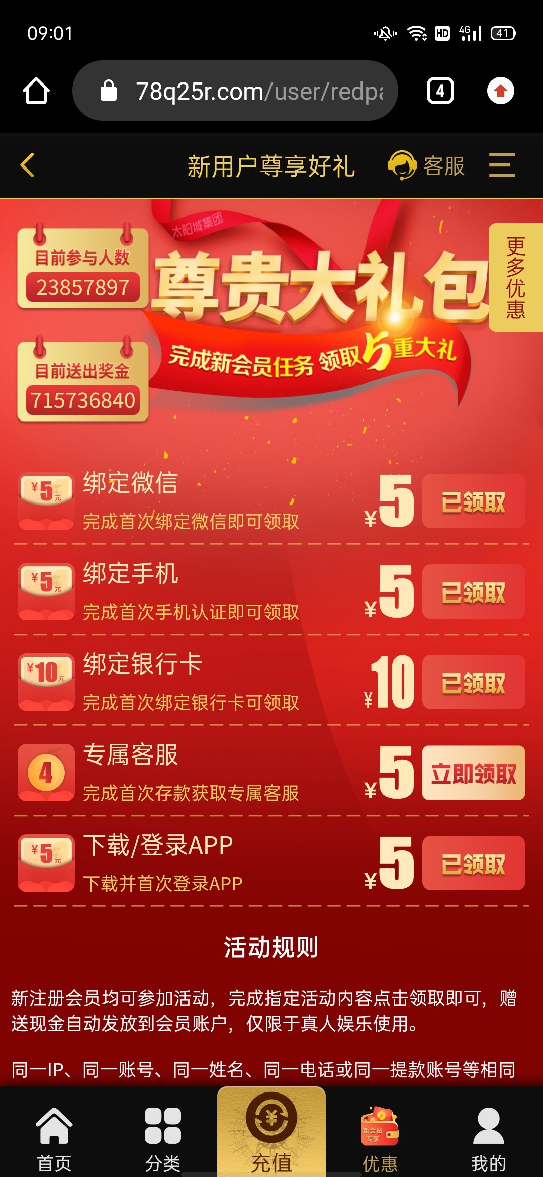 注册绑卡一些列下来一共25彩金