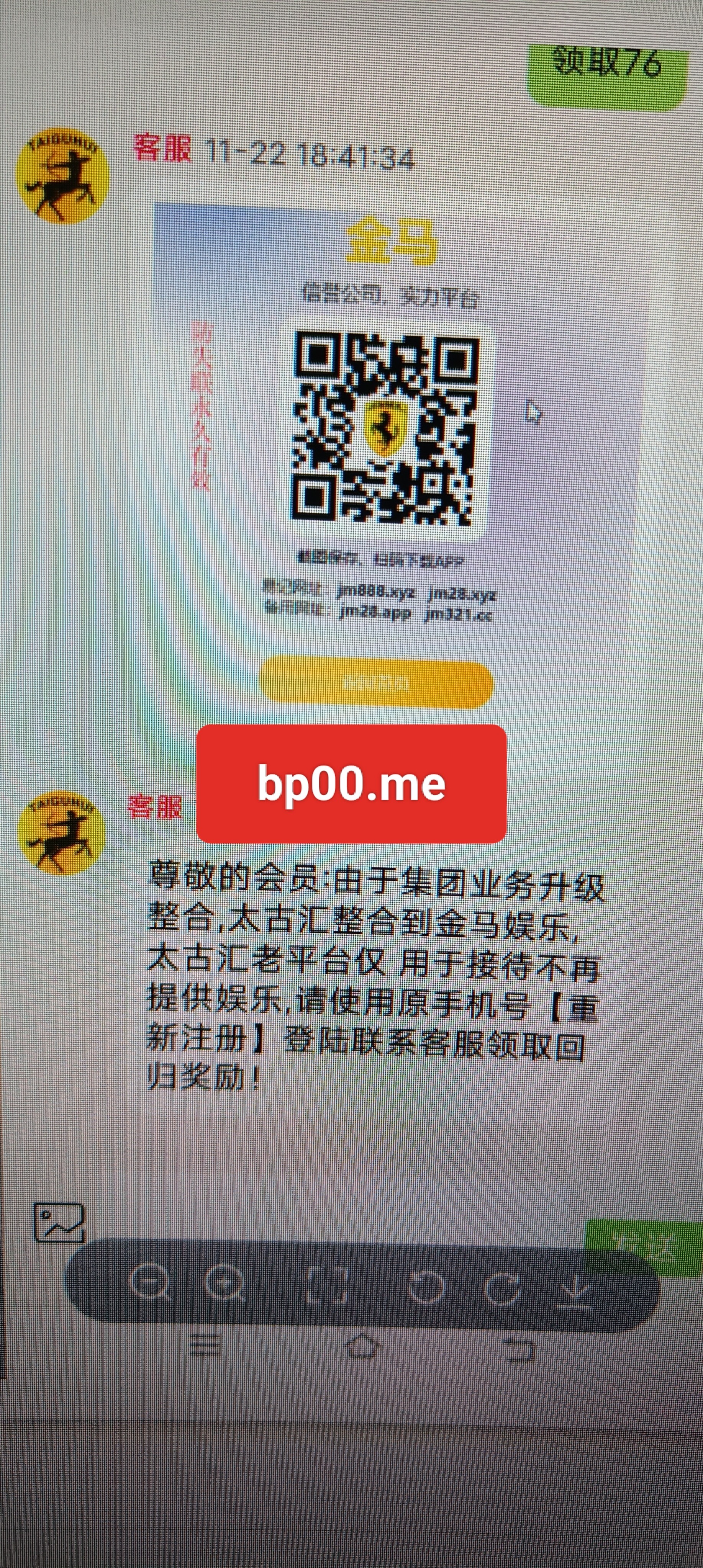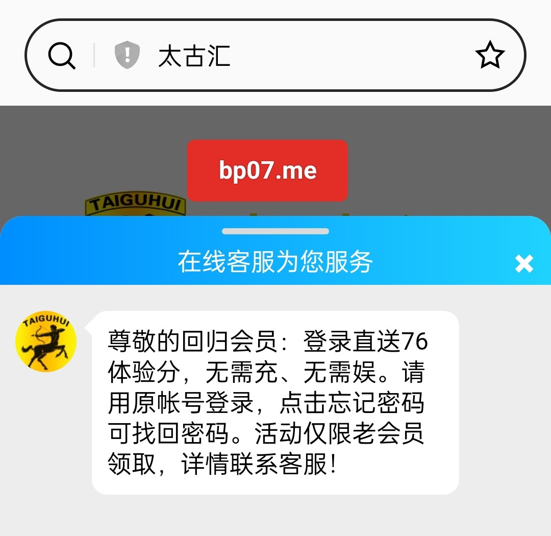 原太古汇转到金马娱乐敬的会员:由于集团业务升级整合,太古汇整合到金马娱乐,太古汇老平台仅用于接待不再提供娱乐,请使用原手机号【重新注册】登陆联系客服领取回归奖励!