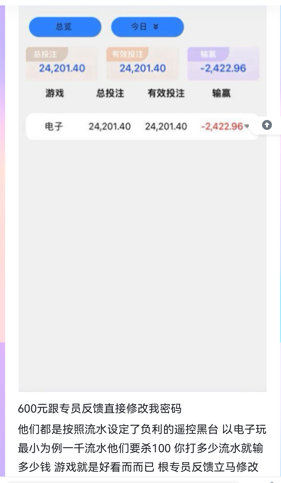 又搞高额优惠活动黑钱了大家注意他们台电子都是私人的 按照比例设定了负利的 以最小的摇麻将 他们按照1千流水杀100 200设定好了杀超了就有回来 比如1千流水你8毛摇一千流水输了400元玩下去肯定会回来300 因为设定了你一千只杀100  赢时也是一样的 你爆多大一千流水你赢了几百元不走百分百玩下去会输到他设定的这个比例 开始时就设定了 没运气说的遥控台