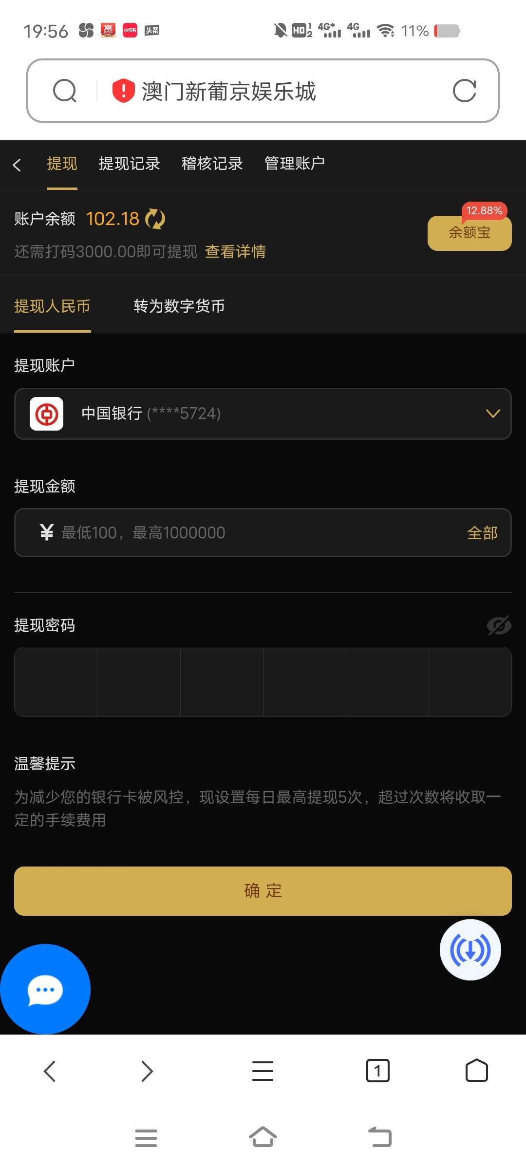 10分钟退回了,要打码6000,曹尼玛