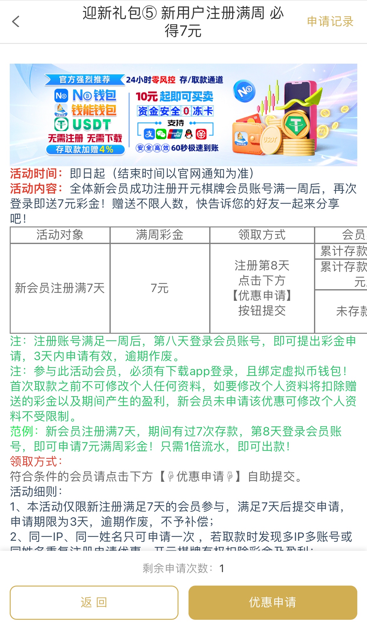 注册满7天第8天优惠里申请,1倍流水100提现