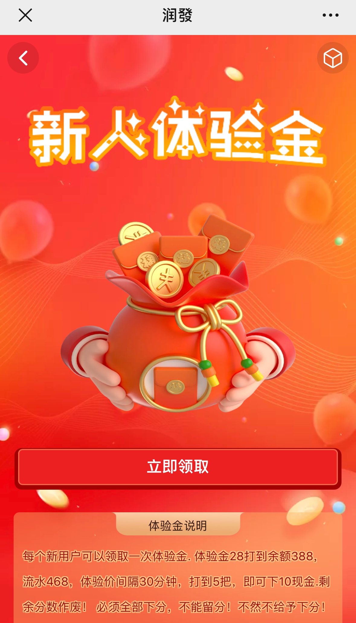 微信扫码用微信登入首页滑到下面有个体验金28打到388流水468间隔30分钟打到5把下10现金